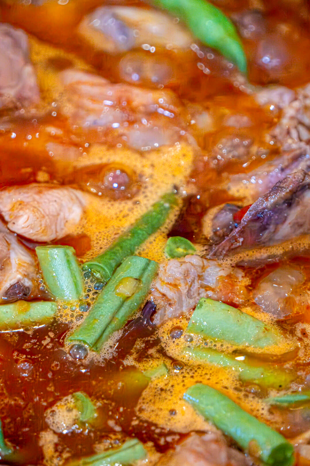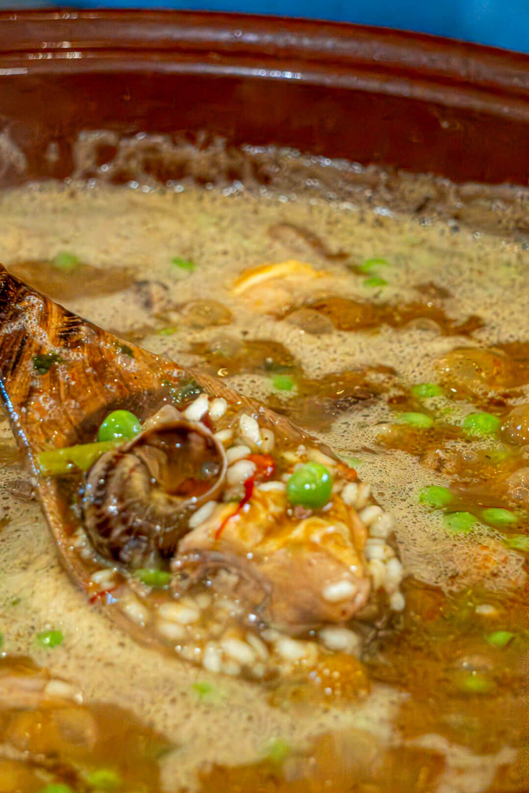 Cuando lo tengamos bien sofrito, le añadimos las judías verdes (o judías finas), el caldo y el agua. Y una vez que la carne esté cocida, incorporamos los caracoles, los guisantes (o chícharos) y el arroz.